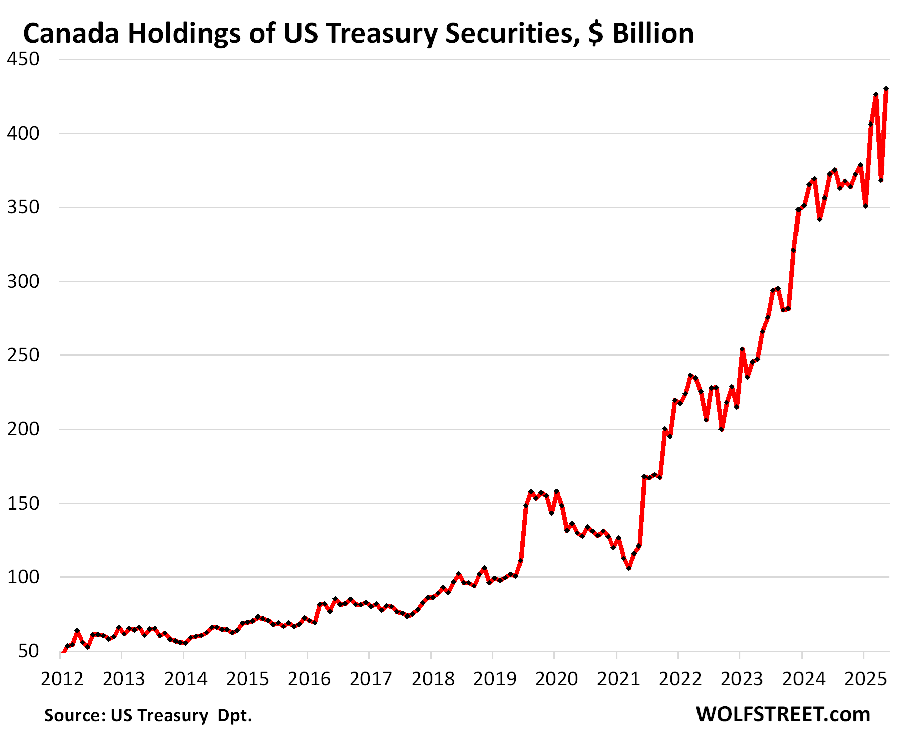 The trade chaos, which is intensely felt in Canada, has introduced unprecedented volatility in its Treasury holdings. But but but… they hit a new record. Since March 2021, holdings have more than quadrupled!
