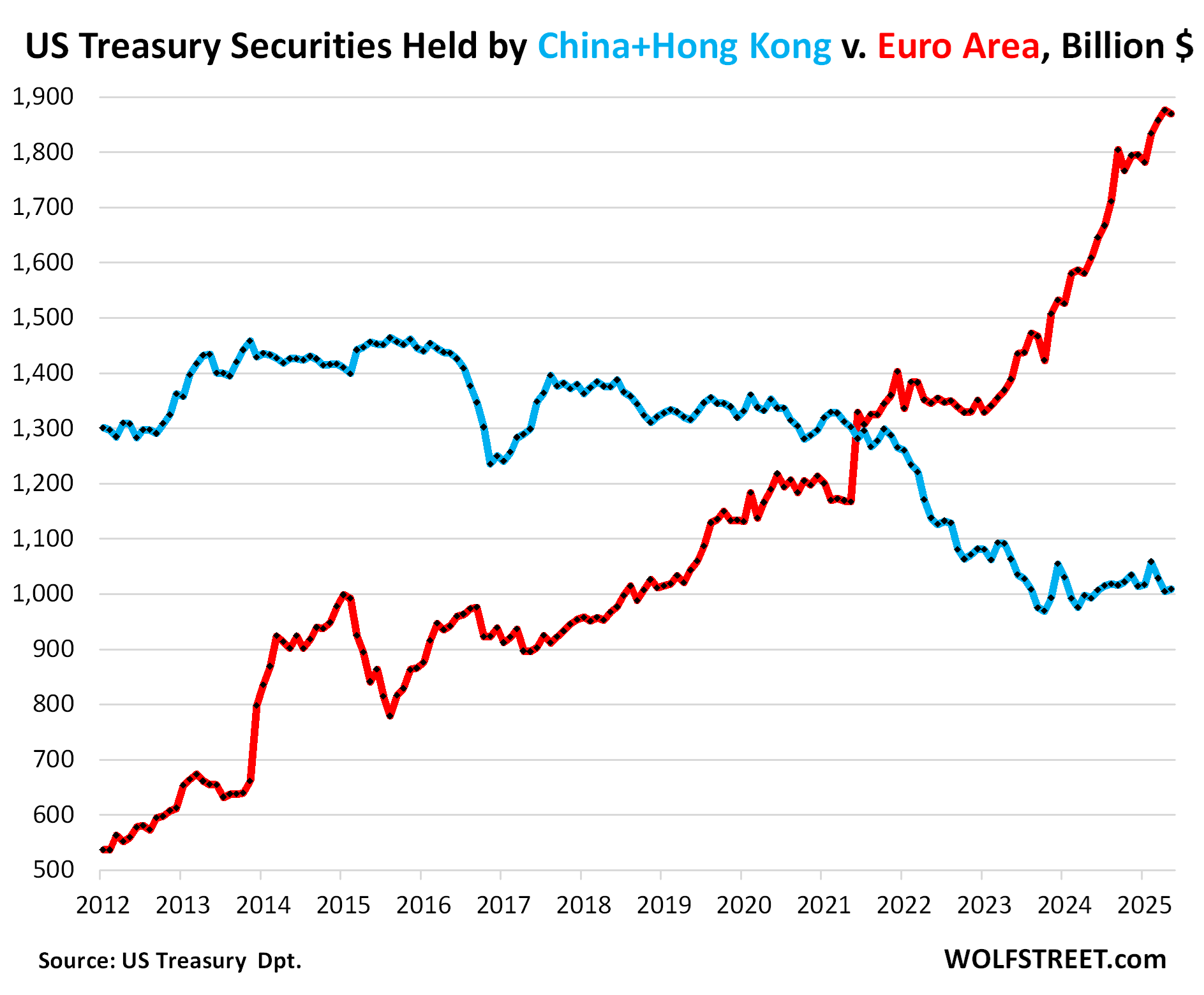 The countries of the Euro Area have bought US Treasury securities hand-over-fist for the past 12 years, more than tripling their holdings, from $534 billion in 2012 to $1.87 trillion now (red).