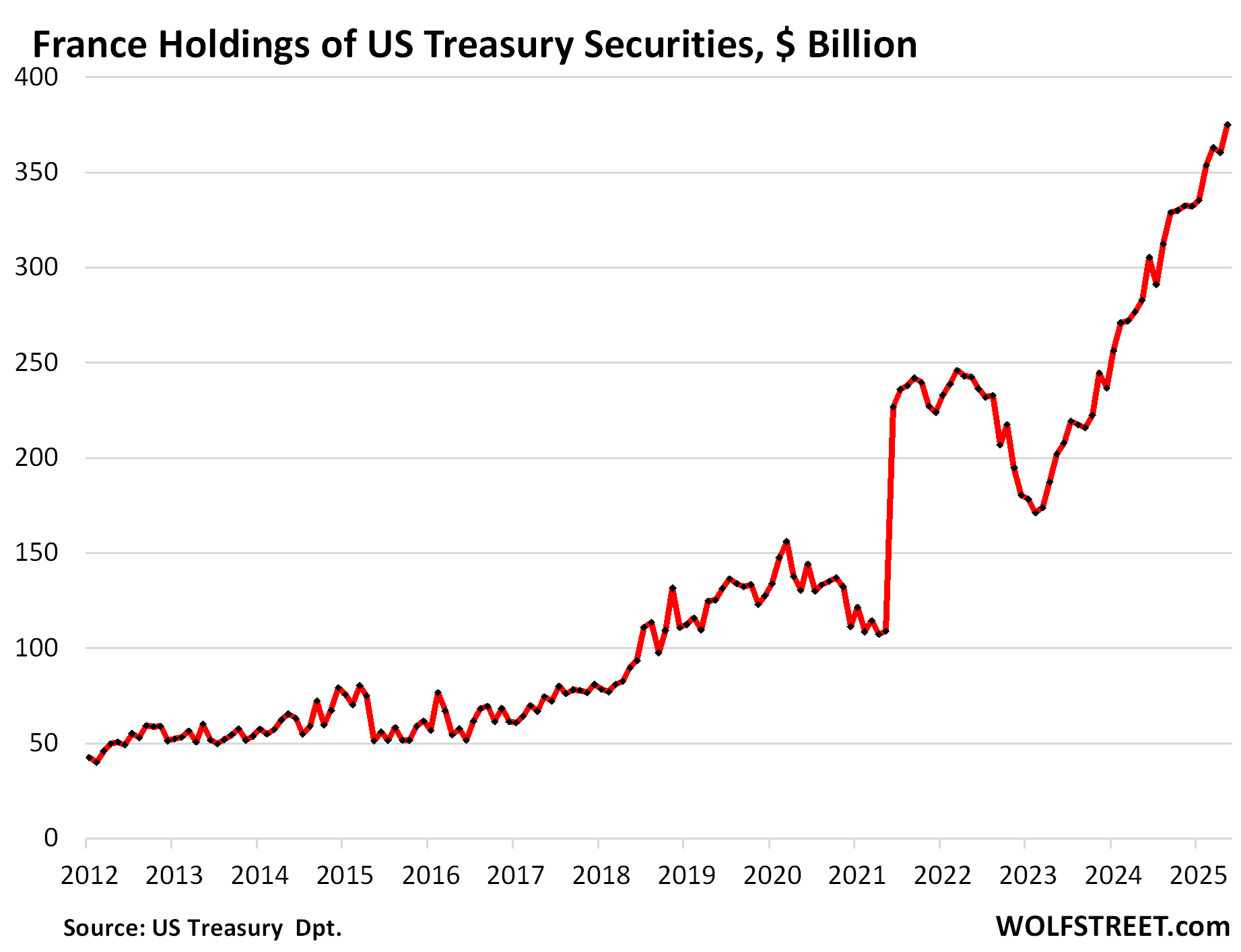 France’s holdings jumped by $15 billion month-to-month, and by $92 billion from a year ago, to a record $375 billion. France’s megabanks are global financial centers.