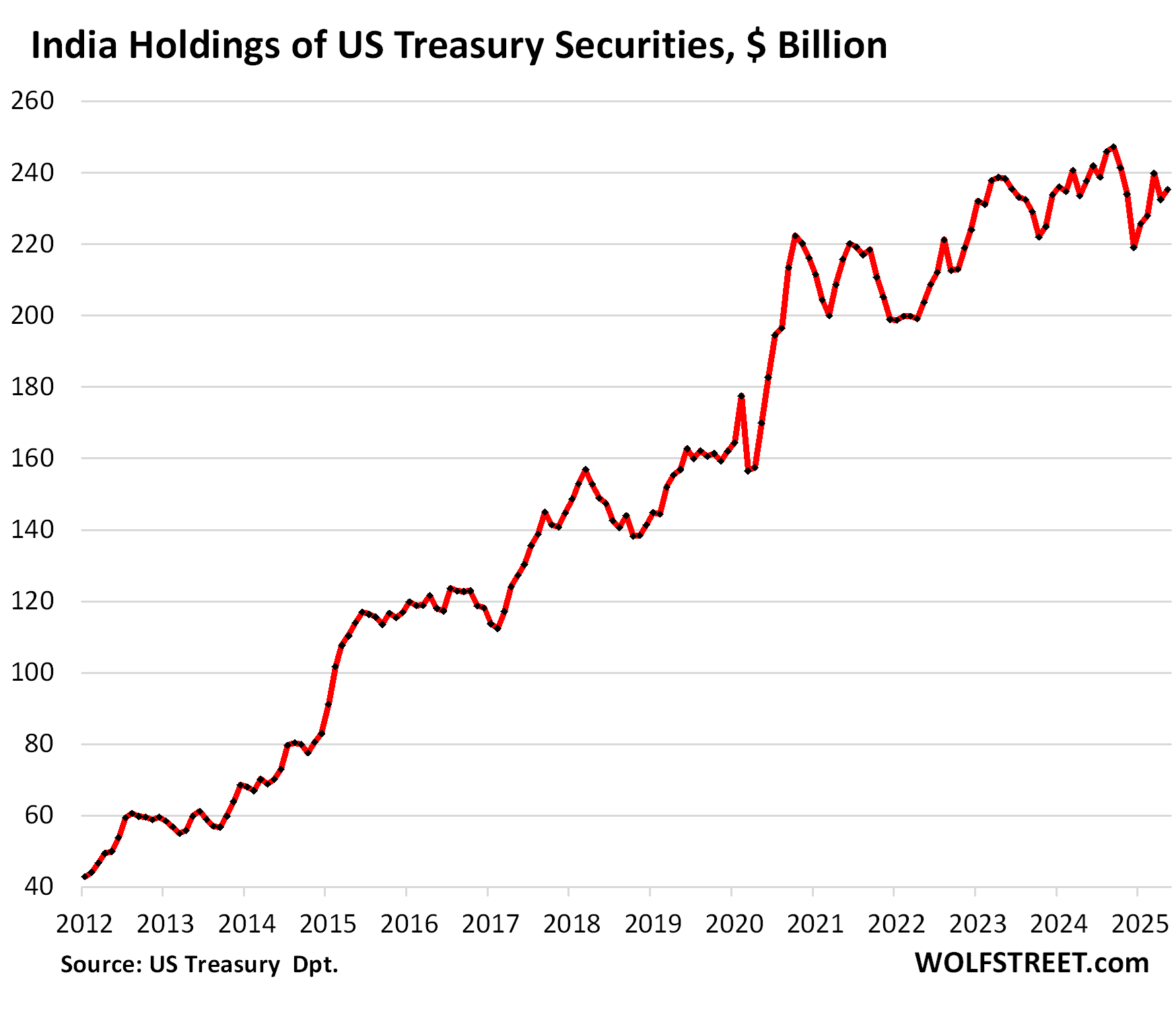 India’s holdings edged up $3 billion in May, to $235 billion, but were still down by $2 billion year-over-year. The high was in September 2024 at $247 billion: