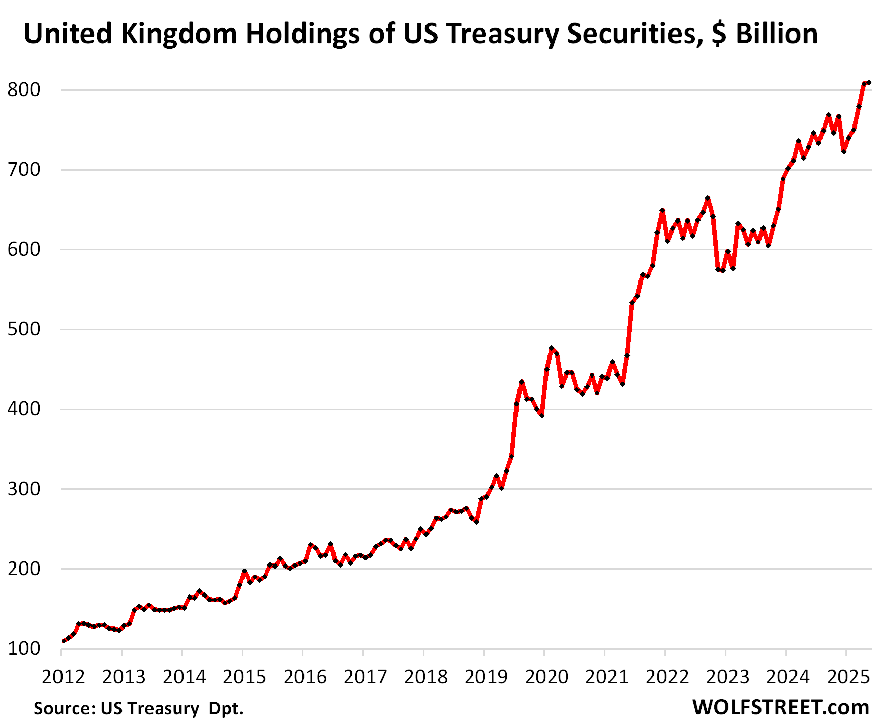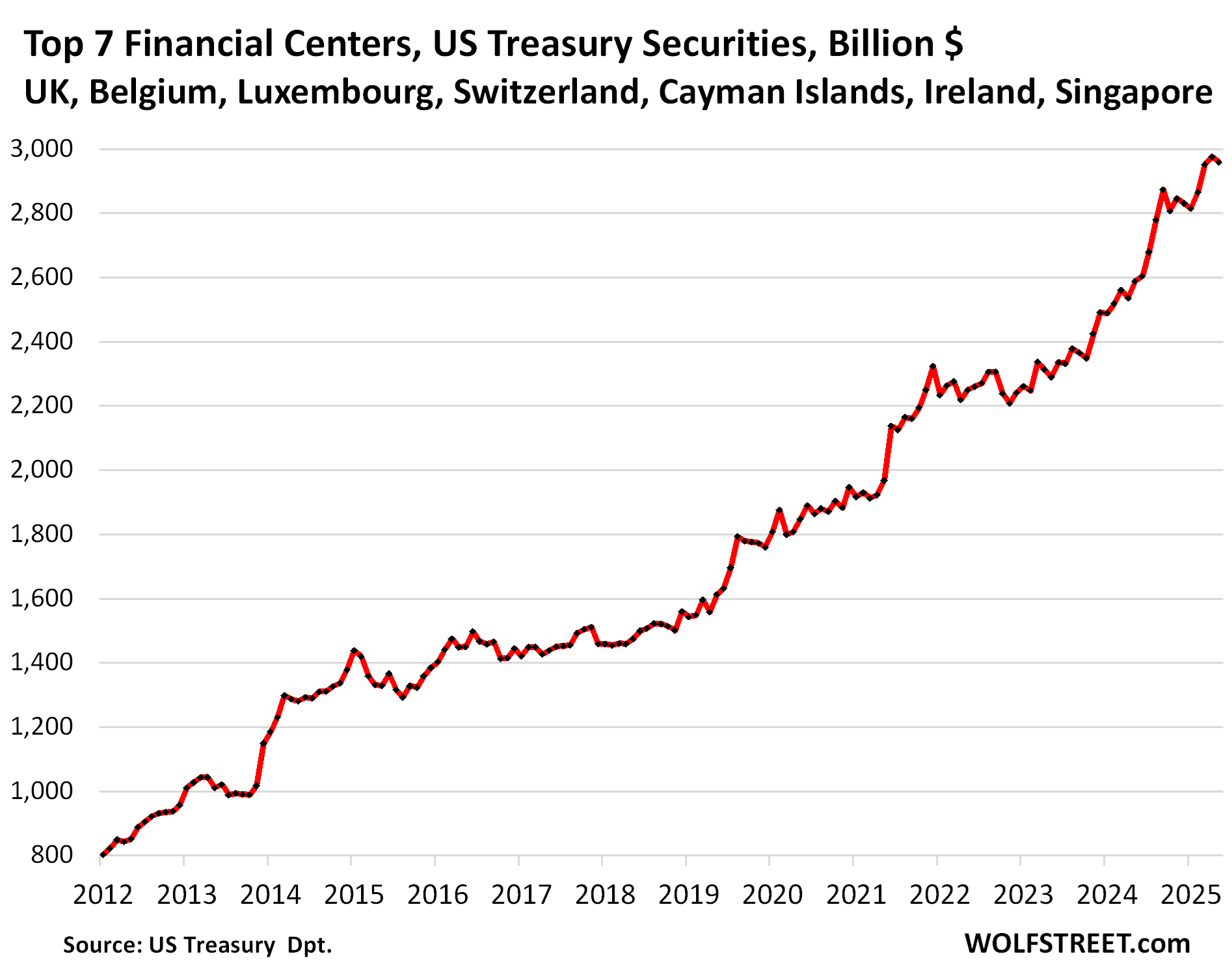 The seven largest financial centers have been on a massive buying binge. Their holdings surged to a record in April, but in May declined by $17 billion, to $2.96 trillion. Over the past 12 months, their holdings surged by $370 billion (+14%!).