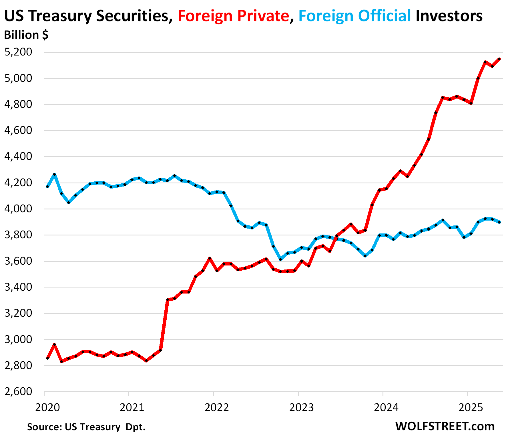 Private foreign investors – such as financial firms, companies, bond funds, individuals, etc., in foreign countries – have piled on Treasury securities from record to record. In May, their holdings jumped by $55 billion, and by $815 billion year-over-year, to a record $5.15 trillion (red).