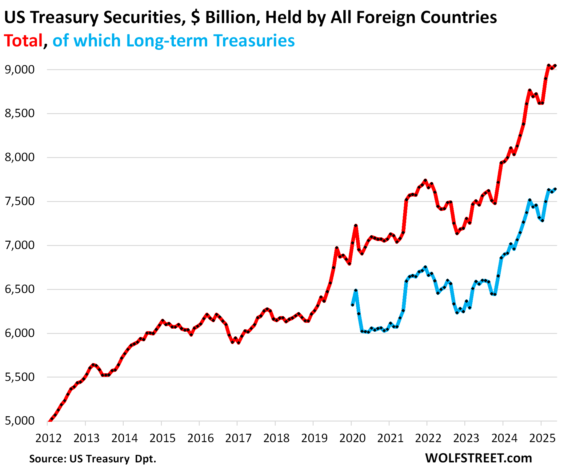 Foreign investors increased their holdings of Treasury securities by $32 billion in May, and by $915 billion year-over-year, to $9.05 trillion, just a hair below the record two months earlier, according to Treasury Department data Thursday afternoon (red line in the chart below). Of that total, $7.64 trillion (84.5%) were long-term Treasury securities (blue), and the rest were short-term T-bills.