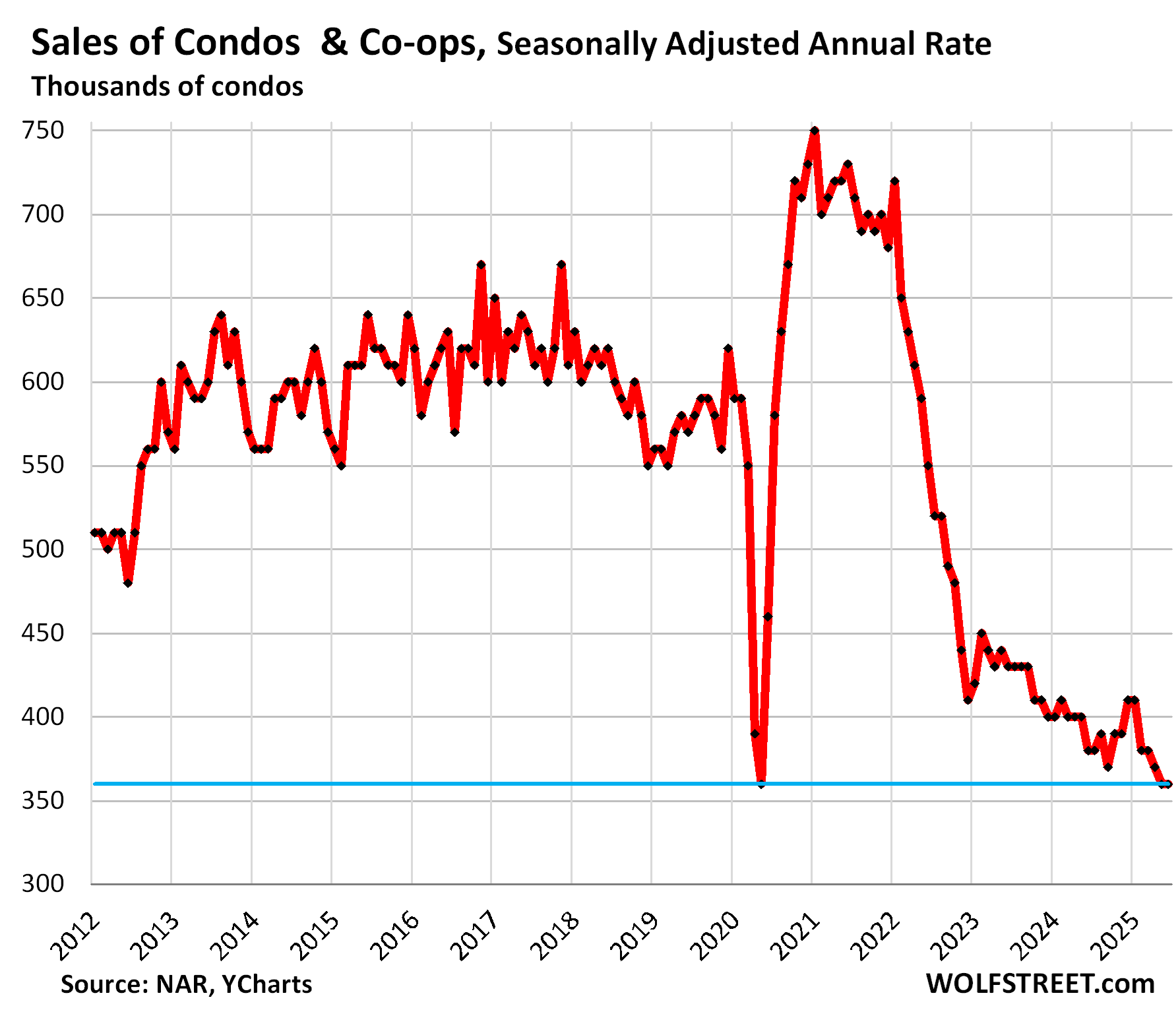 Condo sales in June remained at the low point carved out in May, of a seasonally adjusted annual rate of 360,000 condos, same as May 2025 and Lockdown May 2020, and all of them the lowest in the data going back to 2011. Sales were down by 37% from June 2019. This is the effect of prices having exploded in recent years far beyond what the market can bear, and demand destruction on an epic scale has set in (historical data from YCharts):