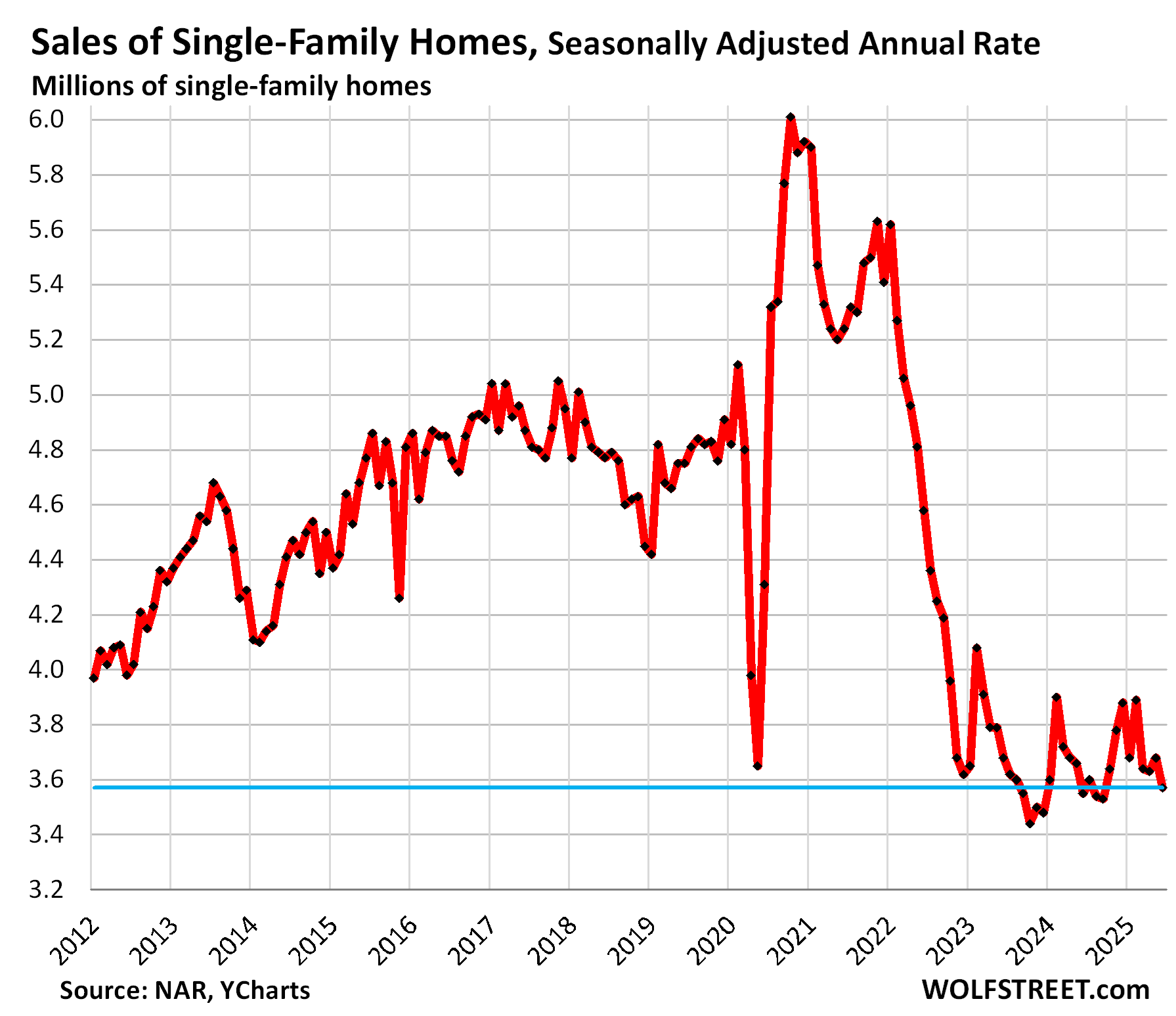 Sales of single-family homes fell further in June, to a seasonally adjusted annual rate of 3.57 million homes, hobbling along the lowest levels since 1995. They were roughly flat with June 2024 – with the year 2024 having been the worst year since 1995. Sales were down by 25% from June 2019, by 28% from June 2022, and by 32% from June 2021 (historical data from YCharts):
