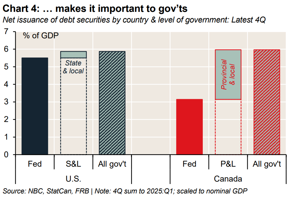 When you combine US federal, state, and local net issuance of debt and compare it to Canadian federal and provincial net issuance of debt over the past four quarters, Canada is borrowing more than the US, in terms of % of GDP.