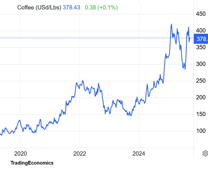 Retail prices of coffee per CPI exploded by 40% in the two years before tariffs were imposed and this has nothing to do with tariffs. That price spike continued for other reasons, and then 15% tariffs on the price of imported green coffee beans ($3.65 a pound) is what? It’s about $0.55, not $4.