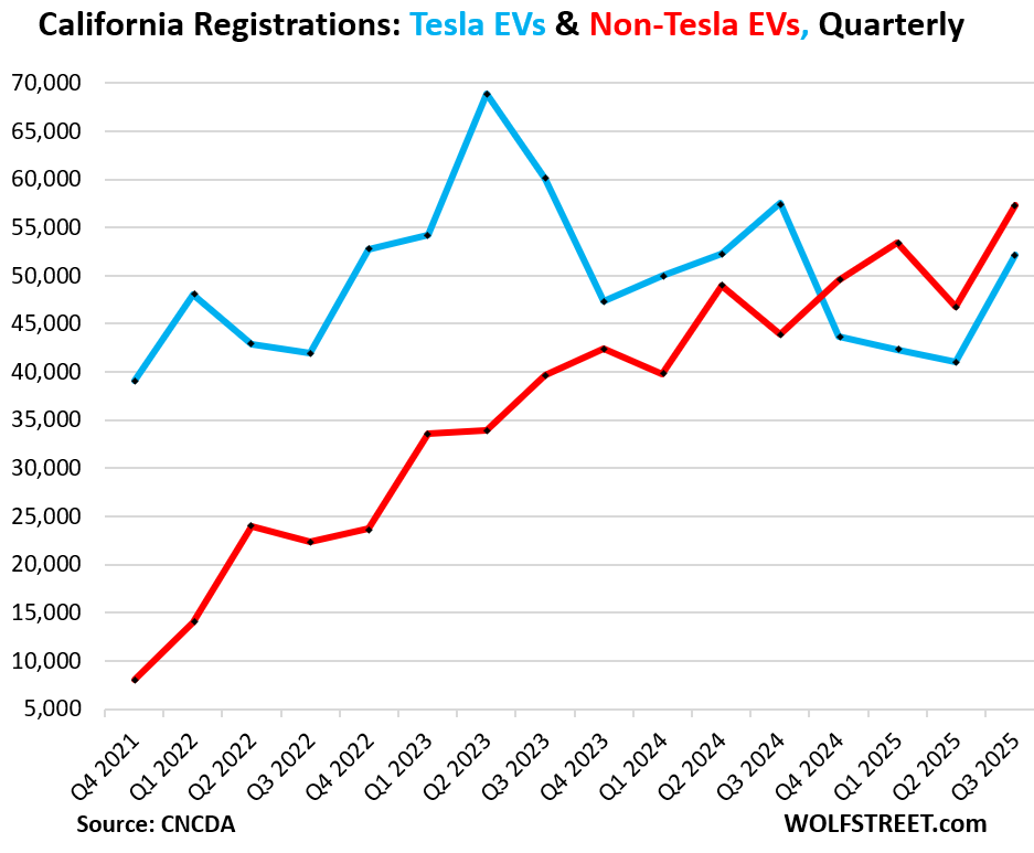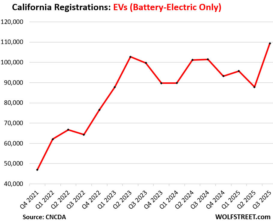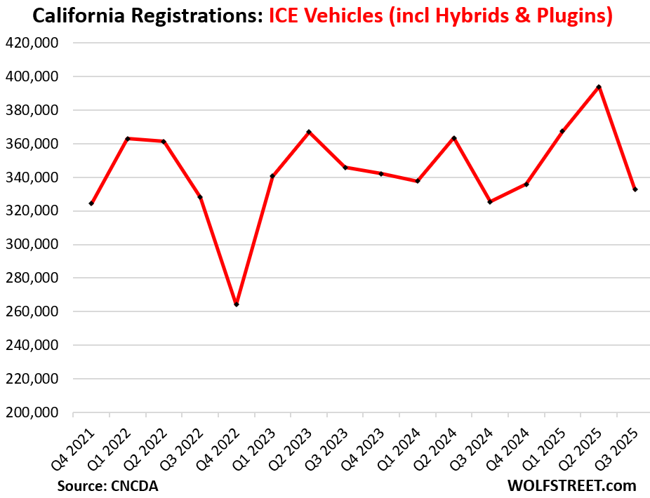 The federal EV incentives finally expired at the end of September, which triggered a surge of last-minute EV-buying nationwide. In California, sales of new EVs spiked by 25% in Q3 from Q2, while sales of new vehicles with internal combustion engines (ICE), including hybrids and plugin hybrids, plunged by 16% in the quarter, according to registrations data from the California New Car Dealer Association (CNCDA).