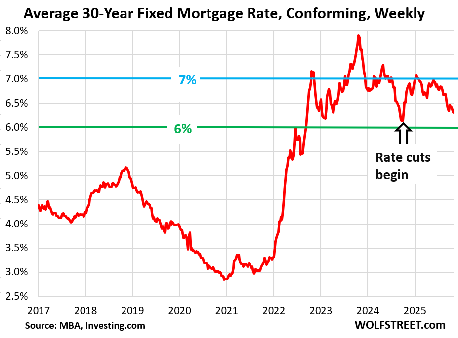 Mortgage rates, according to the MBA’s measure, bottomed out in September 2024 at 6.13%, just before the Fed started cutting interest rates.