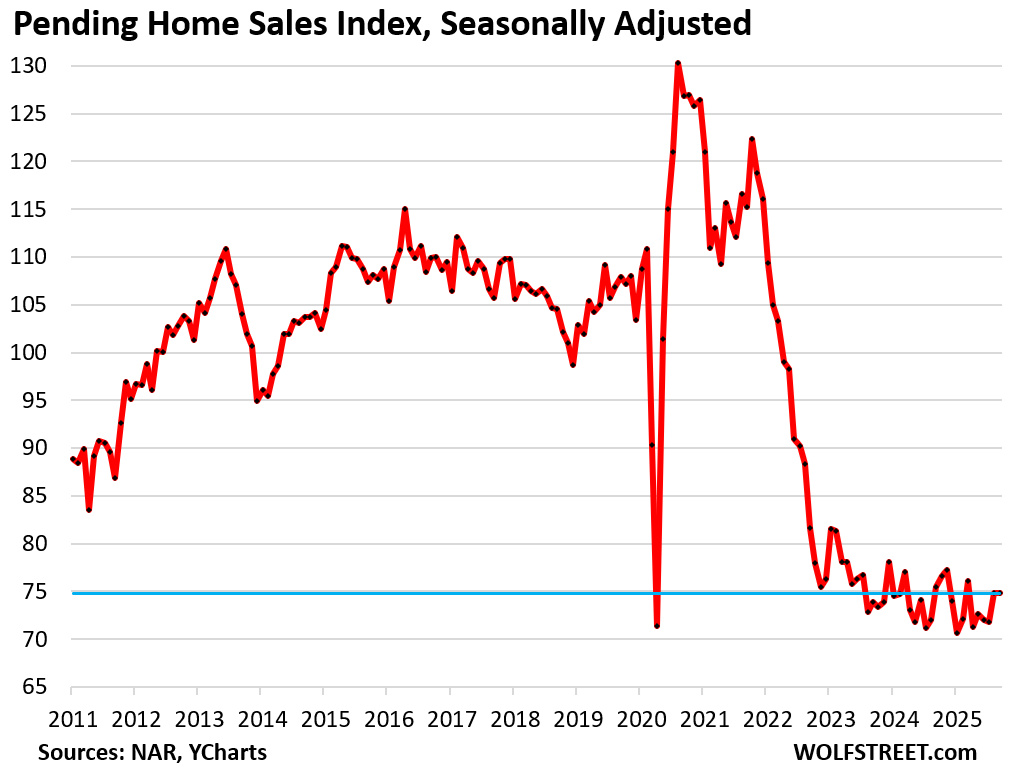 Pending home sales – tracking the number of contracts signed – were unchanged in September from August, and were down 0.9% from the collapsed levels a year ago, seasonally adjusted.