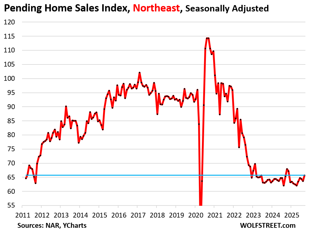 In the Northeast, pending sales rose by 3.1% month-to-month, and were a hair higher than a year ago, seasonally adjusted.