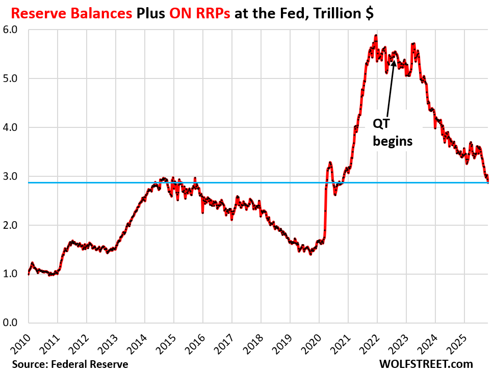 With its QT, the Fed has been targeting these reserve balances. Reserves are liquidity that banks deposit at the Fed and earn interest on (Interest on Reserves, or IOR, 3.9% since the FOMC meeting). Reserve balances had exploded during the years of massive QE.