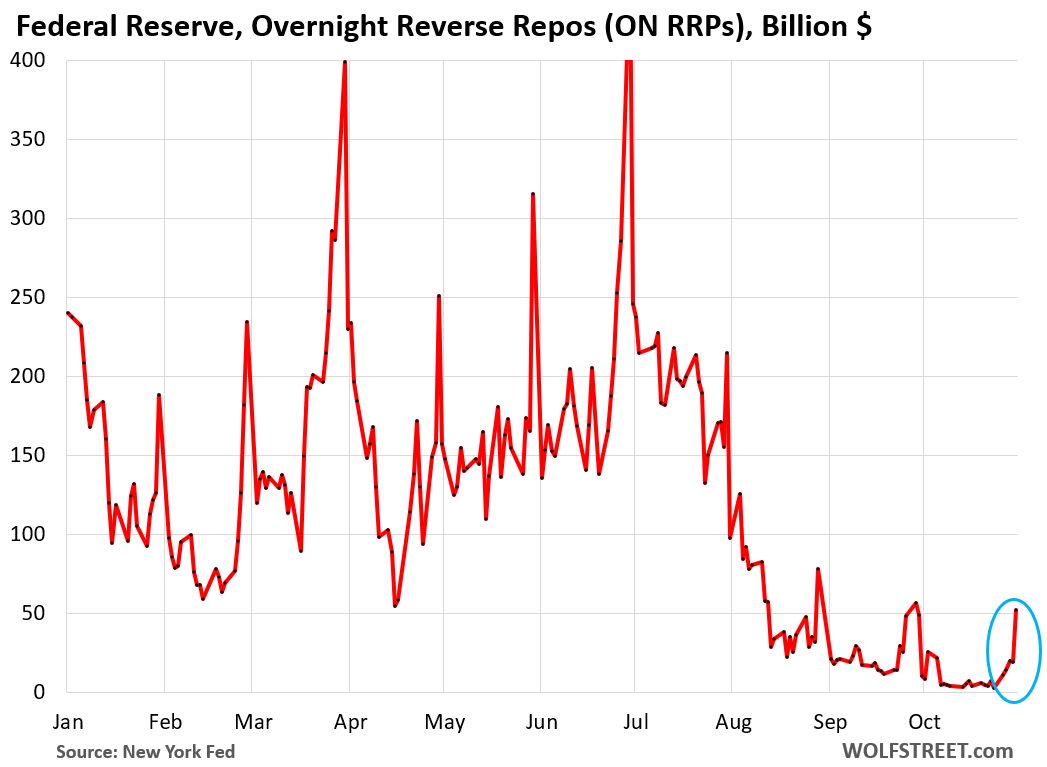 ON RRPs spiked to $52 billion today. A week ago, it was essentially zero. Spiking ON RRP balances at the end of the month and at the end of the quarter have been normal, and this spike was rather small, compared to the prior spikes.