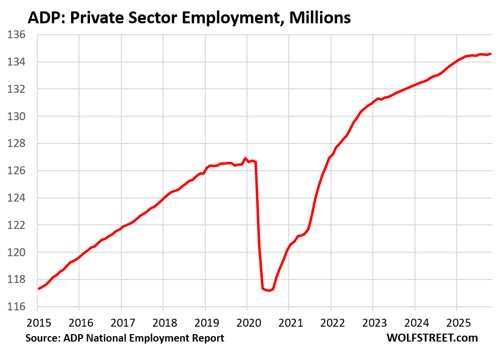 But the two prior months, so employment in September and August, had gotten hammered by the massive annual adjustment for the 12-month period through March 2025, to benchmark ADP’s data to the Quarterly Census of Employment and Wages (QCEW) data released by the Bureau of Labor Statistics in September. These adjustments had nothing to do with employment in August and September, but with employment through March 2025.