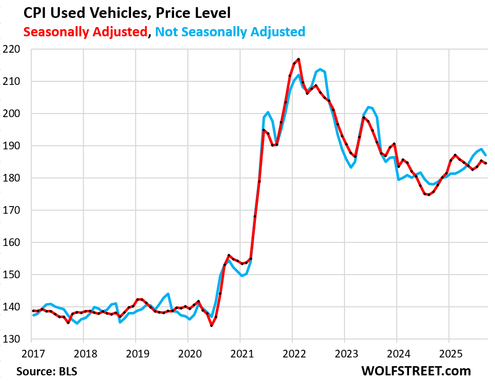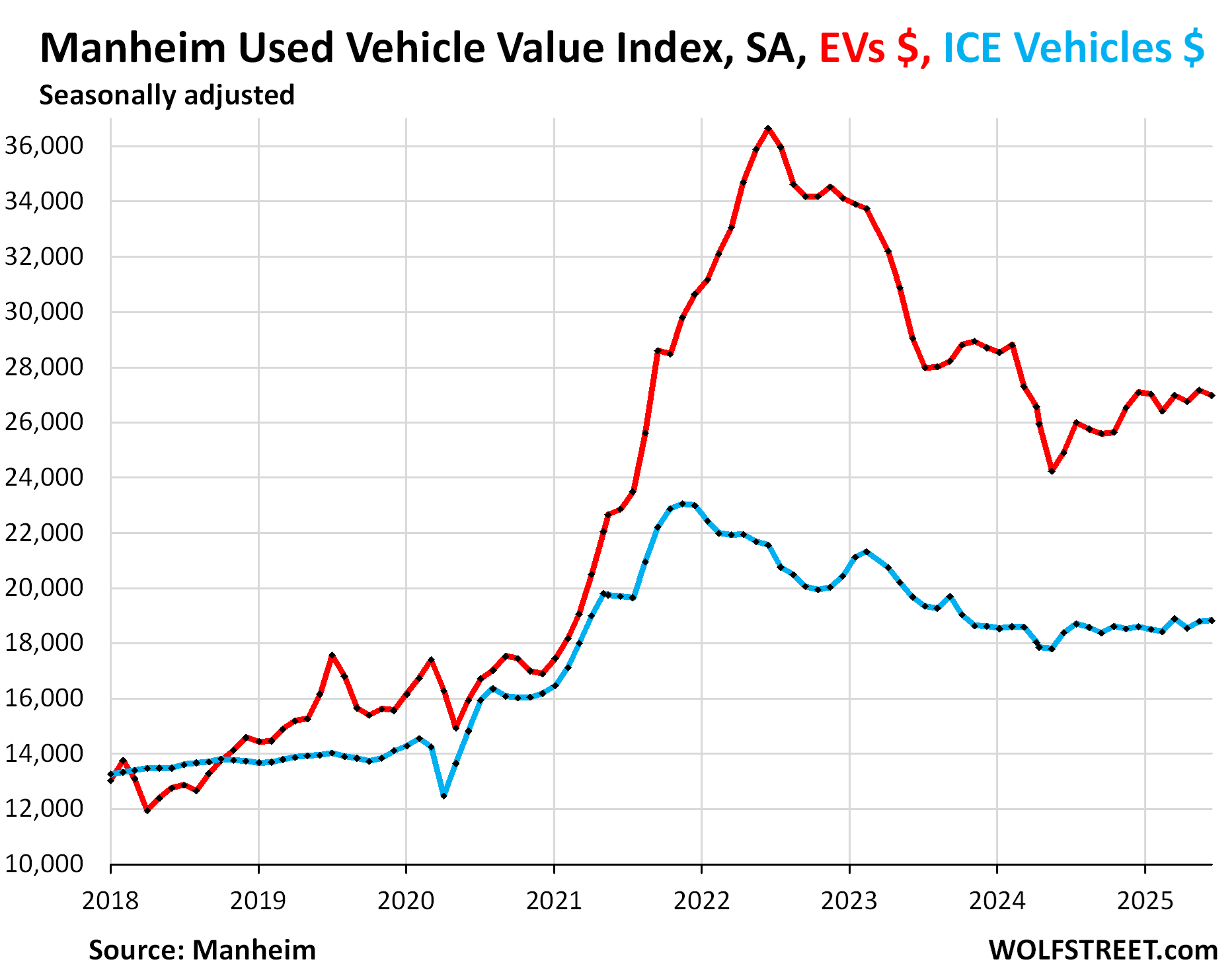 This is just the latest mess to hit the stock. In 2020 to 2022, used vehicle dealers were relentlessly jacking up prices as free-money-besotted consumers were suddenly willing to pay whatever to the astonished dealers who’d never seen anything like that in their lives before. But then that ended.