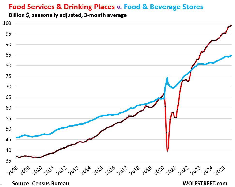 Restaurants and bars are doing just fine, sales are booming, in fact, despite some stupid-ass headlines in the permanent crisis media, though some specific restaurants don’t make it, which is always the case with restaurants, but new ones spring up all the time, which is part of the constant renewal cycle, and some specific restaurant chains serve terrible overpriced junk food and no one should ever eat there, and fewer people do, and it shows.