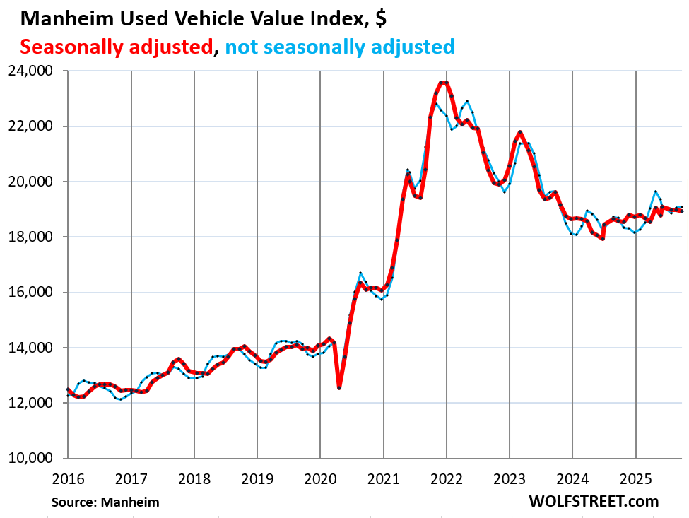 Used-vehicle wholesale prices had spiked in a similar range from mid-2020 through mid-2022, as per Manheim’s Used Vehicle Value Index. Dealers go to these auctions to replenish their inventory; these auction prices are part of their costs of goods sold.