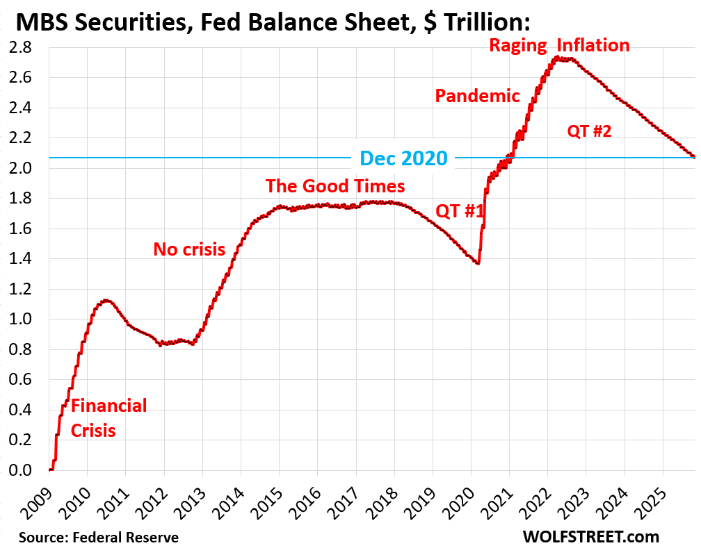 Even after QT ends, MBS will continue to come off the balance sheet until they’re gone, and will be replaced by Treasury bills (mature in one year or less), according to the Fed’s plan outlined in the October meeting.