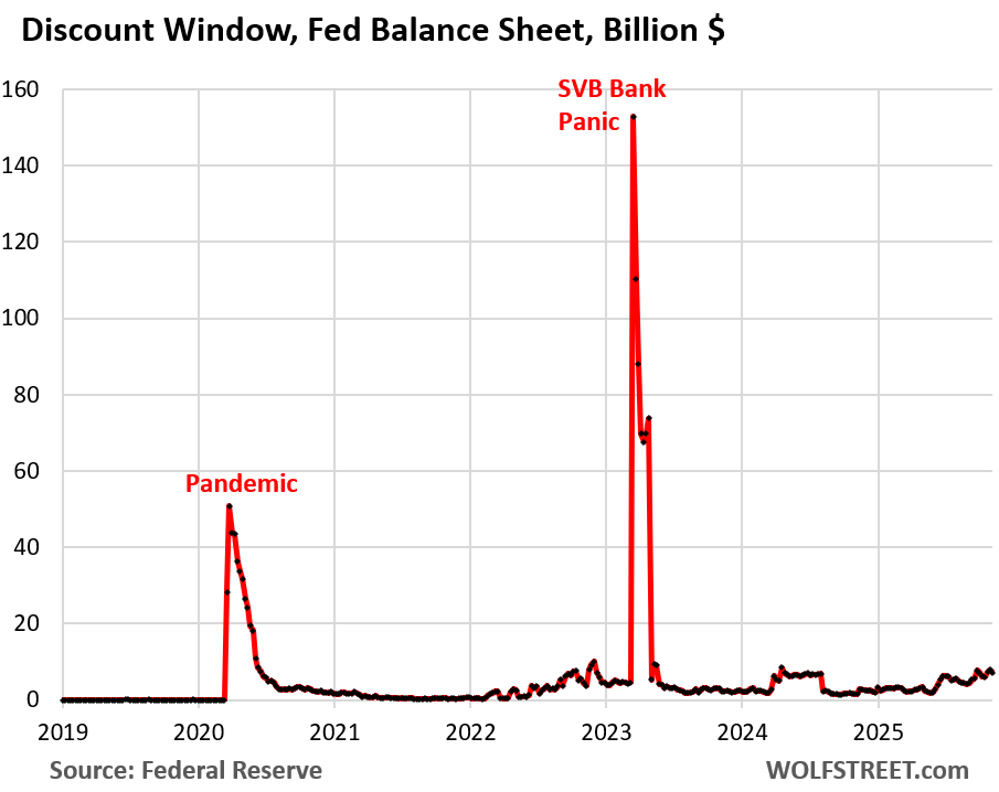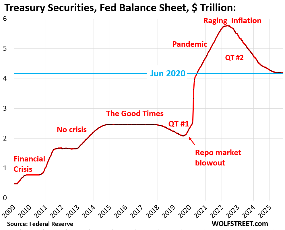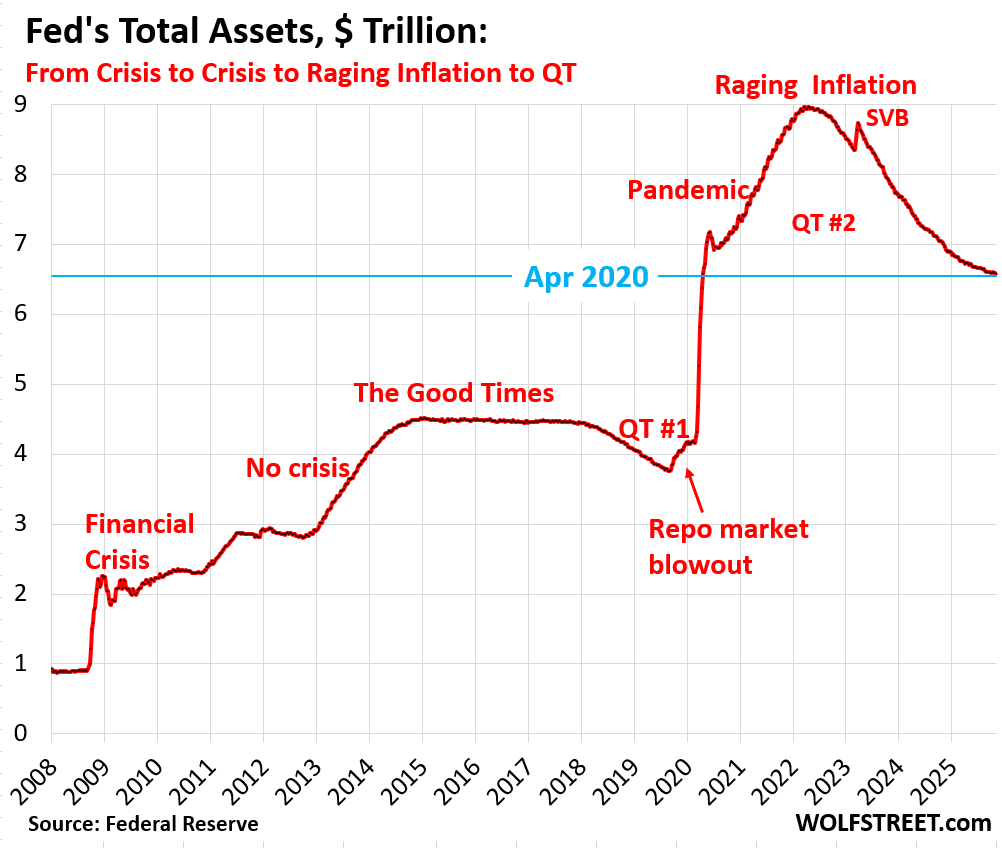 All combined, the total balance sheet declined by $14 billion (-$22 billion +$8 billion) to $6.57 trillion. Since the peak of its balance sheet in April 2022, the Fed’s QT has shed $2.39 trillion, or 26.7% of its total assets. Since the reduced pace of QT began in June 2025, the balance sheet has declined on average by $20 billion per month.