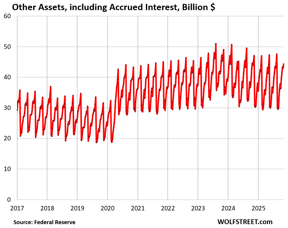 “Other assets”: +$8 billion to $44 billion. This $8 billion consisted mostly of accrued interest from its bond holdings. The Fed set up the accrued interest as a receivable (an asset) in October that will be paid in November, at which point the Fed destroys that money, and the balance drops again.