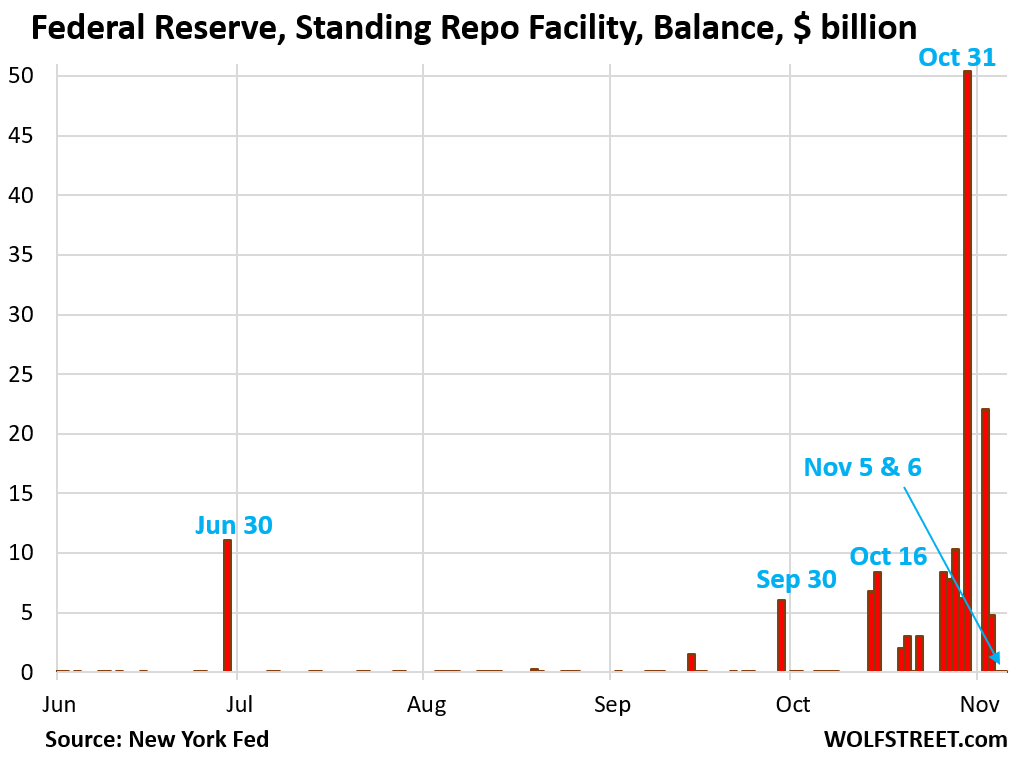 On Monday, that $50 billion got unwound, and banks took up a new $22 billion, which got unwound on Tuesday, and banks took up a new $5 billion in repos, which got unwound on Wednesday, and no repos were taken up on Wednesday and the balance was zero, as by then repo market rates had dropped well below the SRF rate, and today, the balance was also zero with no activity. And the repo market has calmed down. The SRF had done its job.
