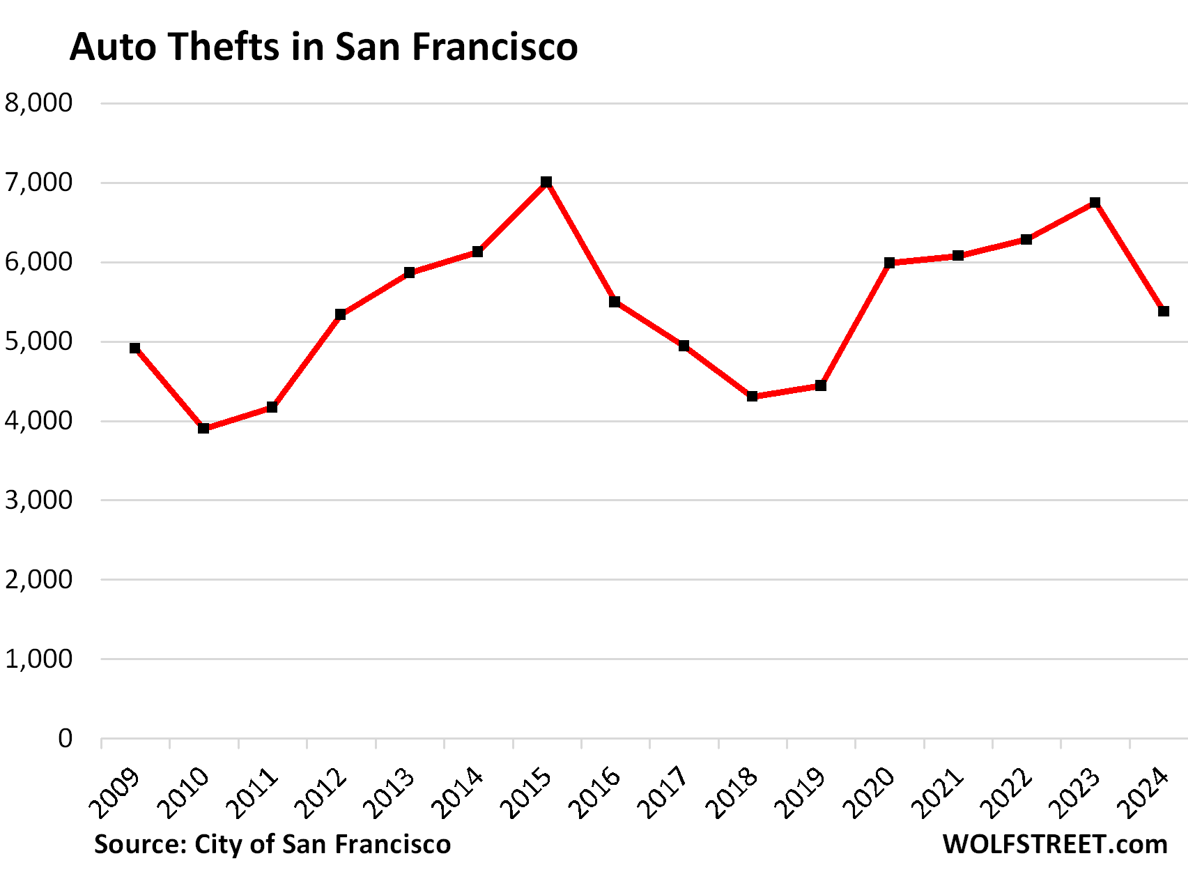 Number of Auto Thefts in San Francisco, by year: