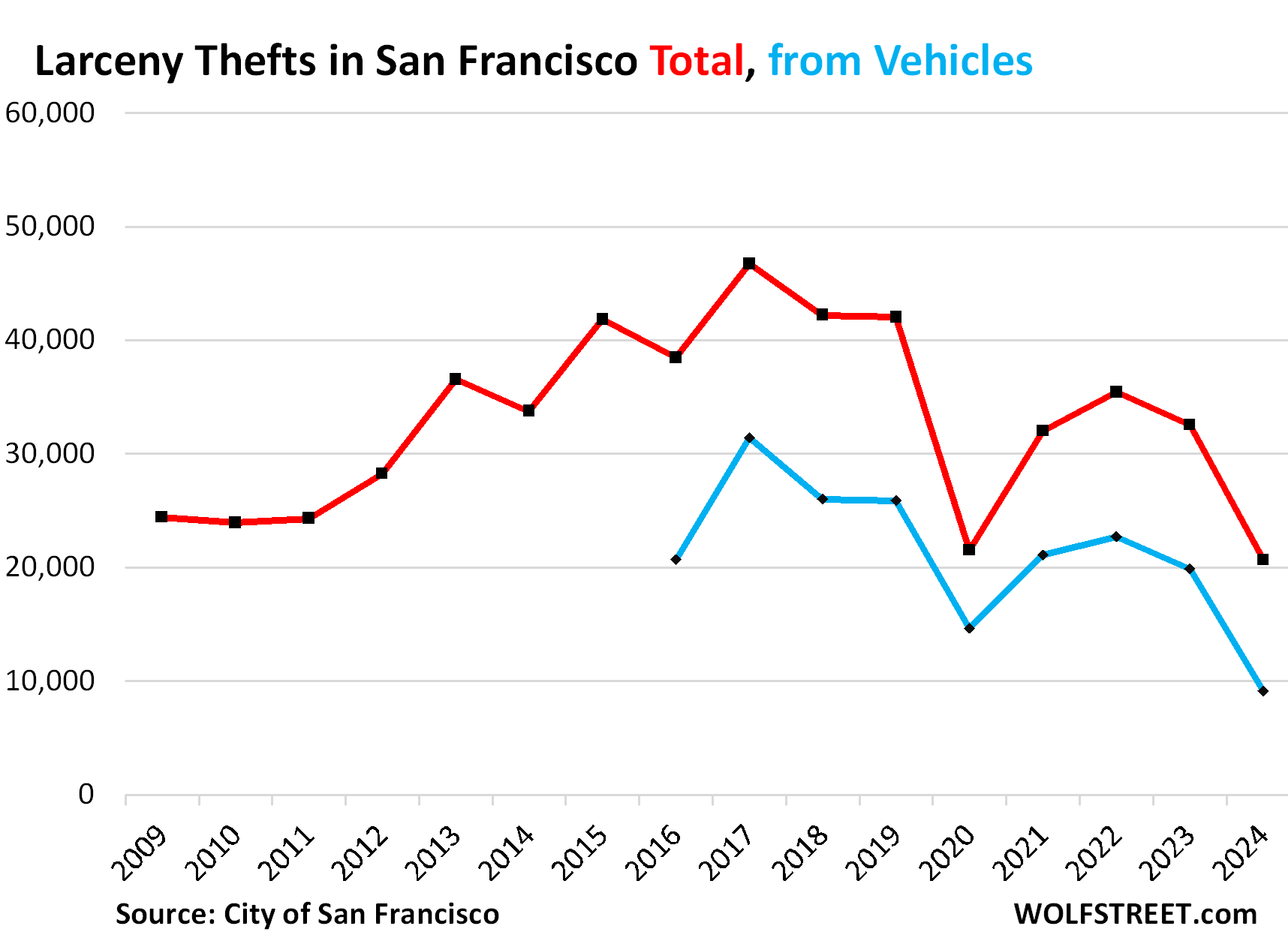 Number of Larceny Thefts in San Francisco, including Thefts from Vehicles (blue) by year: