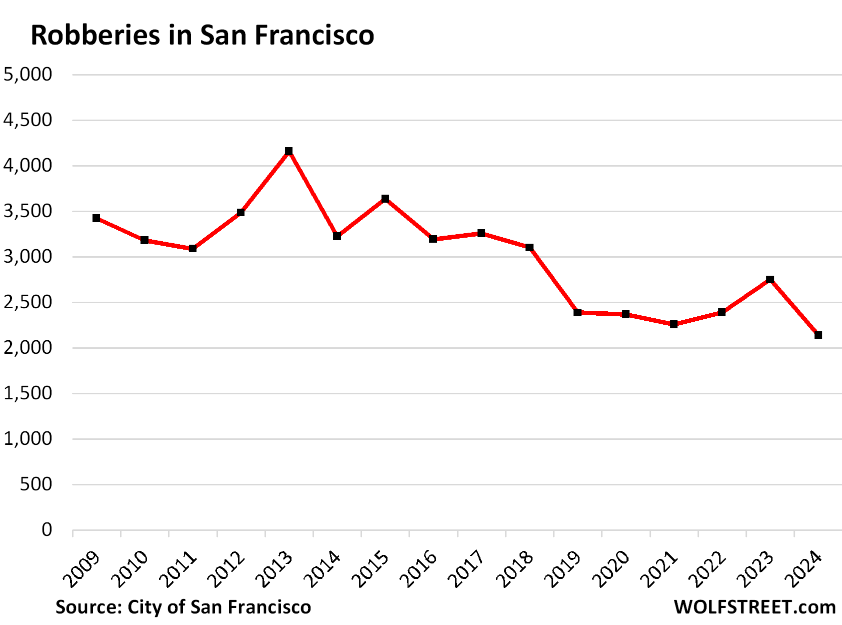 Number of Robberies in San Francisco, by year: