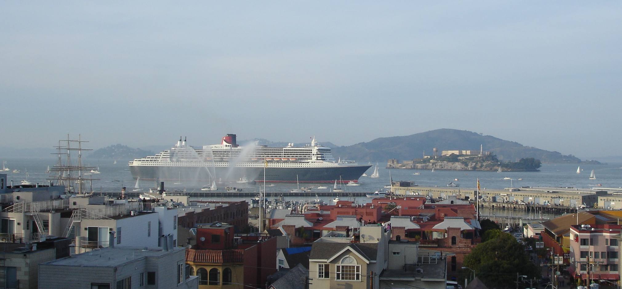 Or San Francisco Fog. The marine layer is blowing in from the Golden Gate at sunset and smothers Alcatraz. Sticking out behind it: Angel Island.